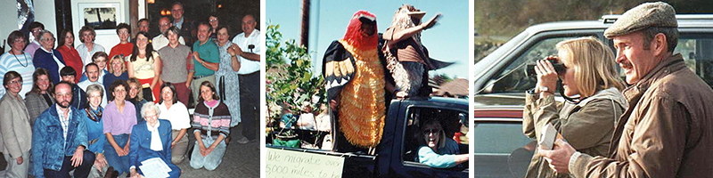 Pictured in the photo montage above, left to right: The very first meeting, at Esther Robbins-Hutton’s house, called by Emma Amiad (left end of the middle row) and addressed by Hazel Wolf, the white-haired matriarch seated in front; Joy Nelsen and Dan Willsie on a birding field trip in 1990 or 1991; two members wearing Bonnie Wilkins’ migratory bird costumes in the Strawberry Festival parade entry in 1993 or 1994, with Joy Nelsen and Steve Caldwell inside the truck.