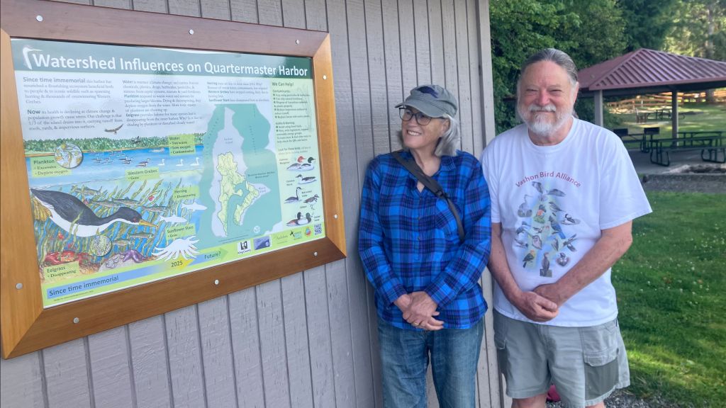 Two richly detailed signs depict the disappearance of Western Grebes from Quartermaster Harbor—triggered by the loss of herring, a staple in the bird’s diet—and urge residents in the bay’s large watershed to take steps to protect it.