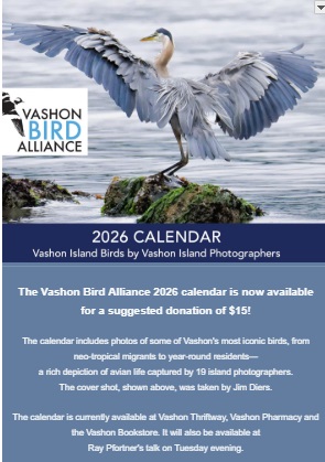 Copy for the signs was written by Rayna Holtz, a Vashon naturalist and former VBA board president, and designed by Sandra Noel, a well-known nature illustrator. Sue Trevathan, also a former VBA board president and long-time coordinator of the region’s Christmas Bird Count, and Steve Hunter, VBA’s current president, worked with Rayna and Sandra to bring the two signs to completion.
