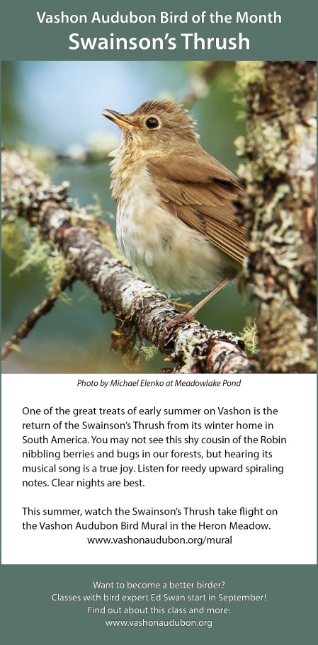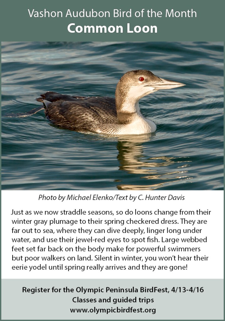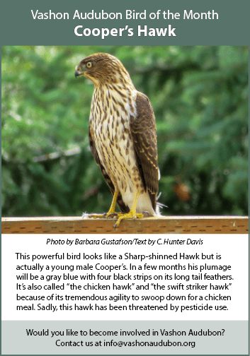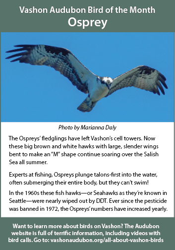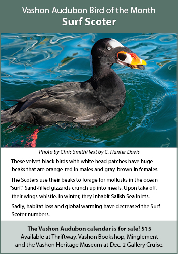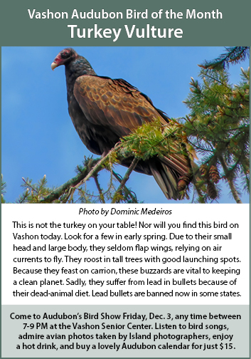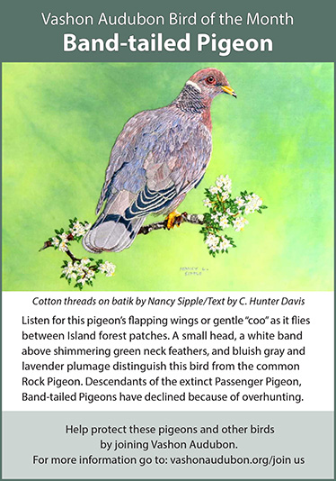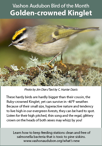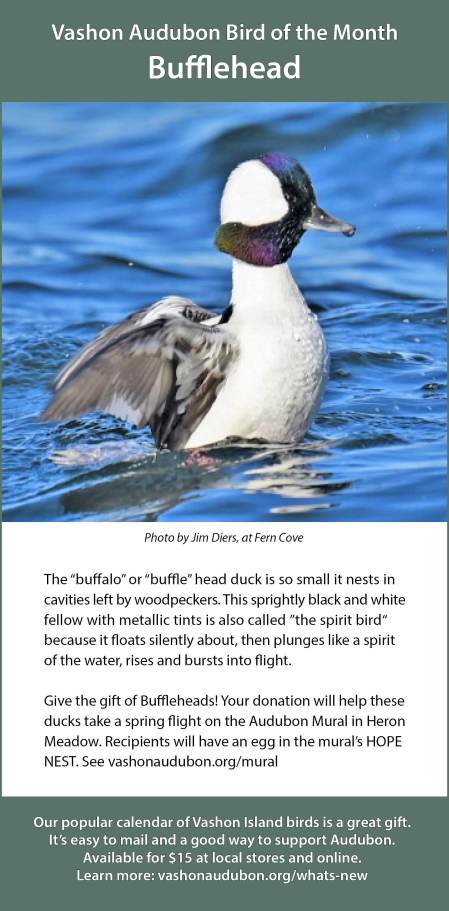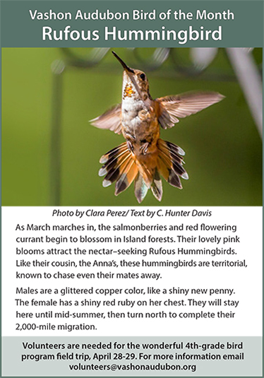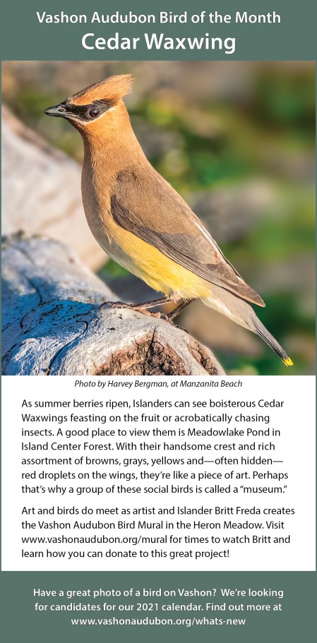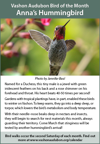 Vashon Audubon publishes “Bird of the Month” in the Island’s Beachcomber newspaper. Produced by Audubon volunteer Hunter Davis, this feature offers fun facts, tidbits of news, and photos of Island birds taken by local photographers. Watch for it!