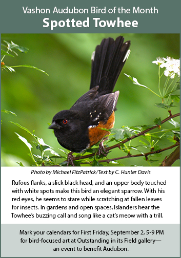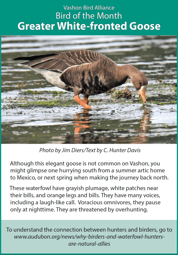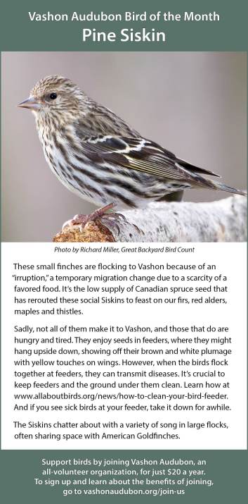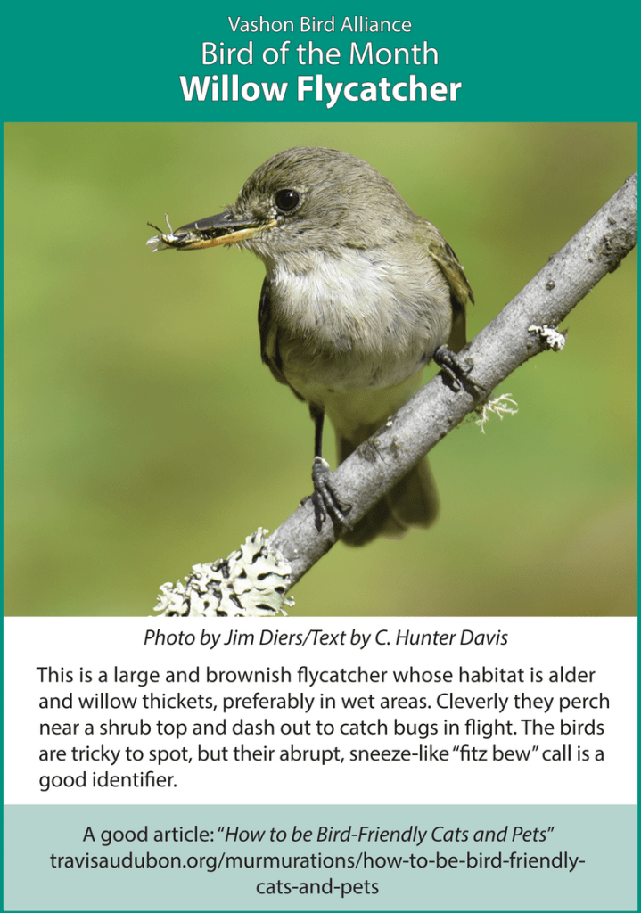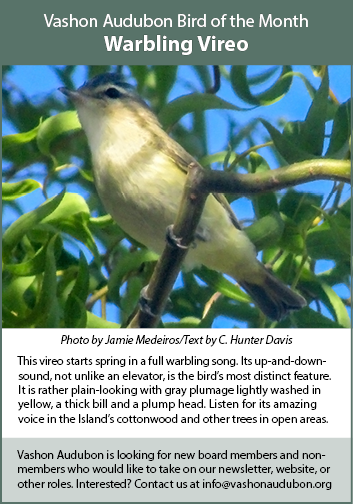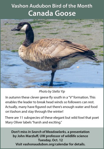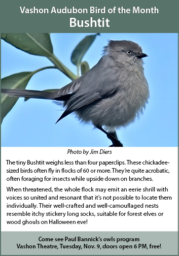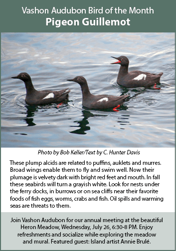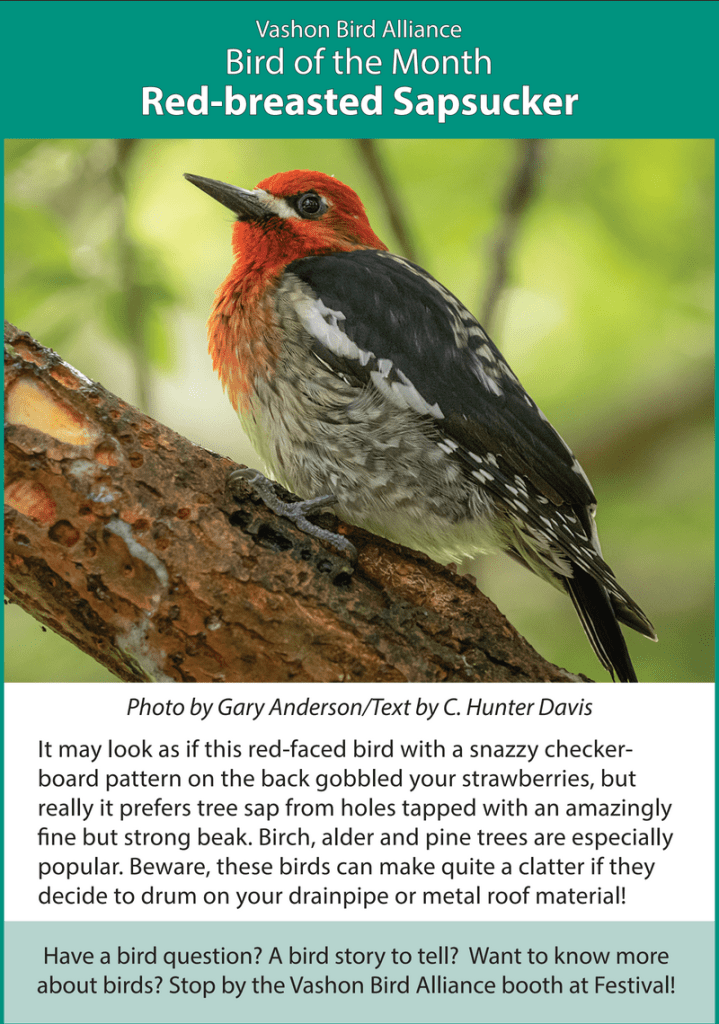 Vashon Audubon publishes “Bird of the Month” in the Island’s Beachcomber newspaper. Produced by Audubon volunteer Hunter Davis, this feature offers fun facts, tidbits of news, and photos of Island birds taken by local photographers. Watch for it!